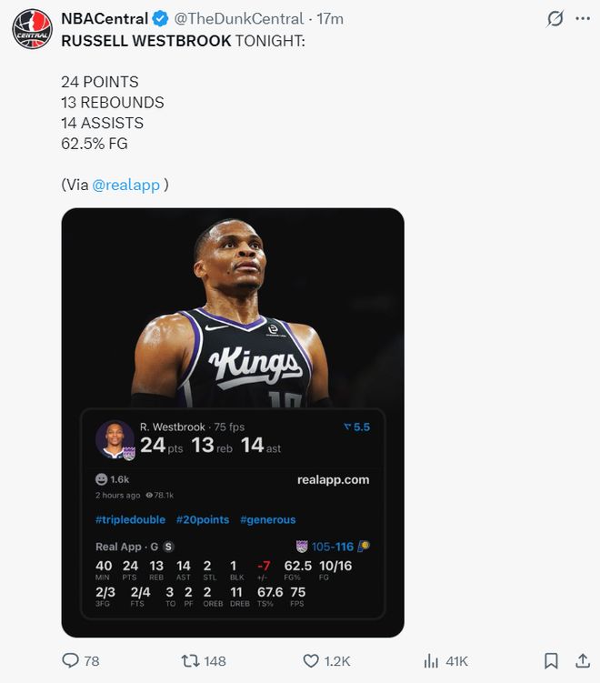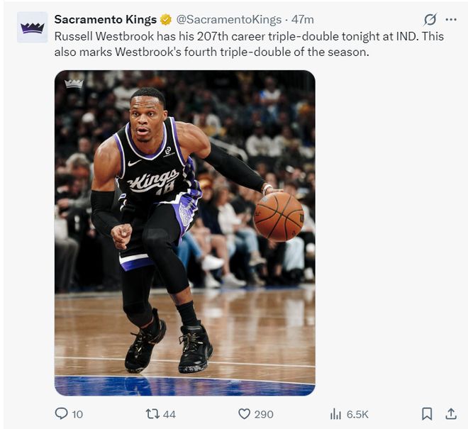 國王隊官方也曬出推文祝賀拉塞爾-威斯布魯克完成自己新的生涯里程碑。