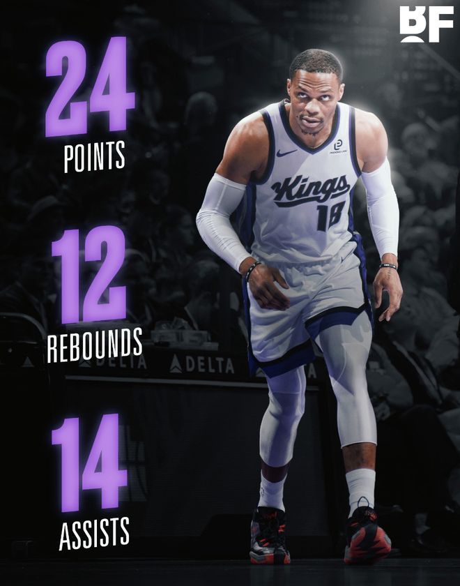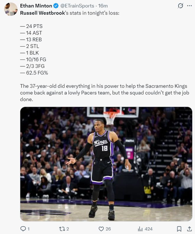 國王記者曬出威少的數(shù)據(jù)致謝道:這位 37 歲的老將竭盡全力幫助薩克拉門托國王隊。