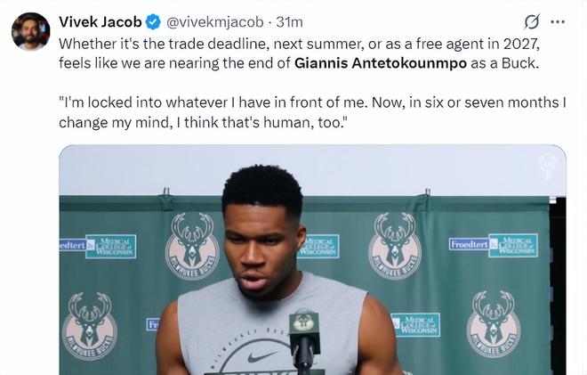 美記Vivek Jacob寫道:從揚(yáng)尼斯的言論來看,他身位雄鹿球員的生涯正在進(jìn)入倒計(jì)時,無論是交易截止日、明年夏天還有2027年夏天,總之他將離開密爾沃基。
