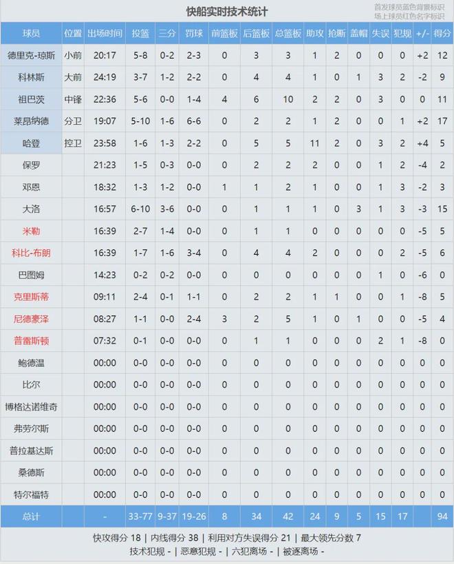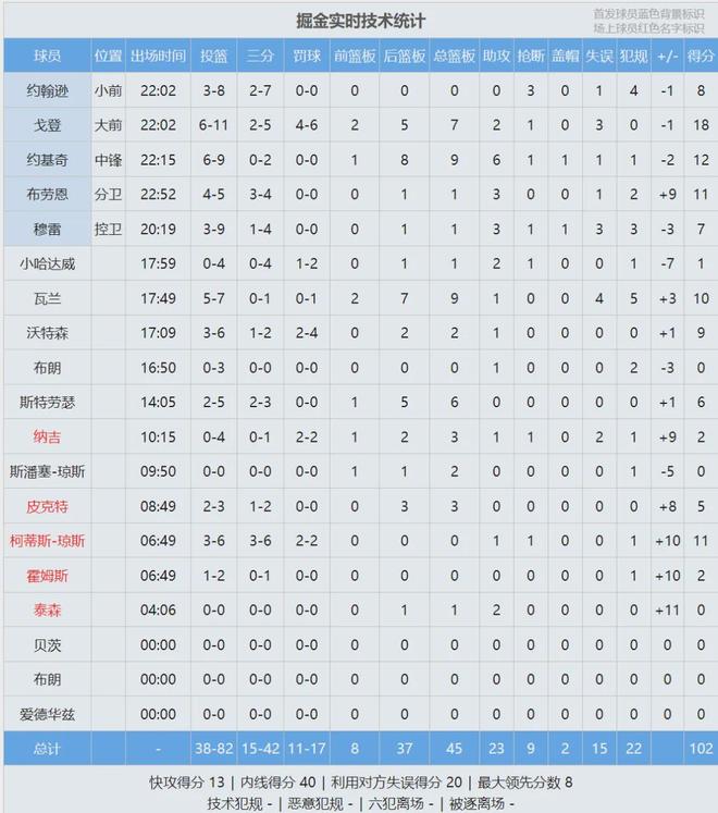 三節(jié)打完,掘金76-75反超。大洛前三節(jié)僅出戰(zhàn)13分鐘,10中6已經(jīng)轟下15分3帽,瓦蘭10分8板。第四節(jié)打了三四分鐘,大洛和保羅逐漸被換下,兩隊(duì)變成第三陣容。最終掘金102-94擊敗快船,戈登18分7板、約基奇12分9板6助。