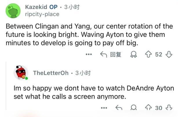 一位網(wǎng)友說(shuō):在克林根和楊瀚森之間,我們的未來(lái)中鋒輪換真是前景光明。裁掉艾頓,讓他們有更多時(shí)間成長(zhǎng),這個(gè)決定遲早會(huì)有大回報(bào)。