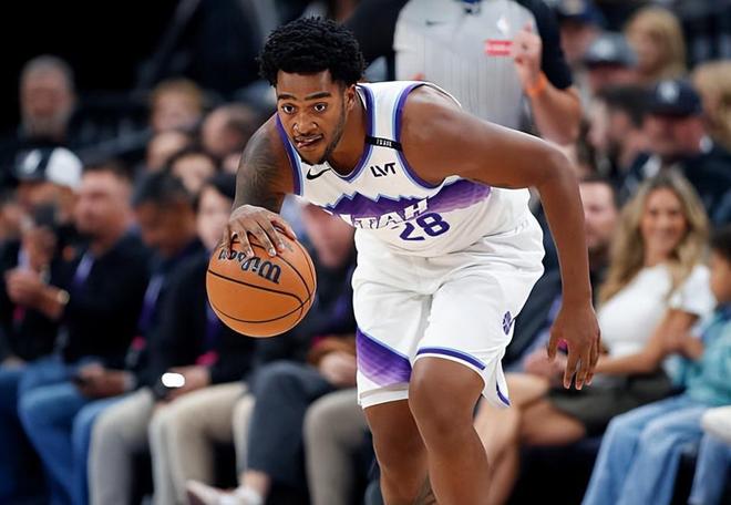 本場比賽中,爵士的替補側(cè)翼新星布萊斯-森薩博(Brice Sensabaugh)的表現(xiàn)令人刮目相看。森薩博全場出場22分41秒,投籃13中7,三分線外7中3,罰球3中3,得到了全場第二高分20分外加4籃板2助攻1搶斷的數(shù)據(jù),還有1次失誤和5次犯規(guī),正負值為+8。森薩博的出場時間其實比較有限,他的出手次數(shù)也不算太多,但是他還是展現(xiàn)出了超強的投射能力,他的中遠距離投籃穩(wěn)定性算得上是相當突出,他也能夠在場上各個位置完成投籃,對手對于他也是很難進行有效地限制。森薩博在其他方面的表現(xiàn)也是值得肯定的,他的進攻選擇合理,他在防守端雖然個人防守能力不算出色,但是至少他也是保持了較高的防守專注度和積極性。總體來看,森薩博是爵士第二陣容中的關(guān)鍵人物,他的不俗表現(xiàn)也為球隊的首輪做出了不小的貢獻。
