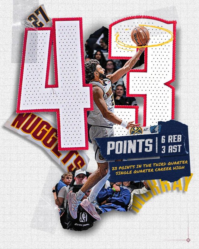 穆雷在第3節(jié)進(jìn)入了得分模式,他單節(jié)12投7中,三分球5投3中,罰球4投全中,以58%的命中率轟下了23分。依靠著穆雷在第3節(jié)的暴走,掘金單節(jié)以45比29碾壓對(duì)手,這也是丹佛最終取勝的關(guān)鍵。并且,單節(jié)23分還創(chuàng)下了穆雷單節(jié)得分新高。